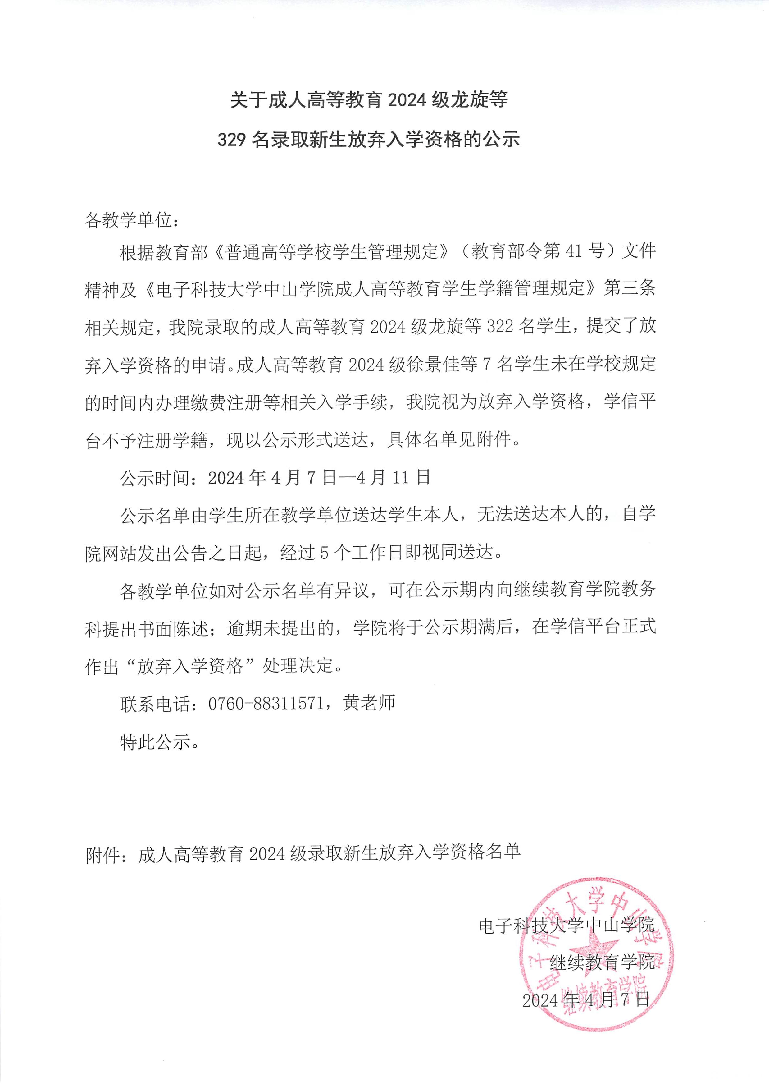 关于成人高等教育2024级329名录取新生放弃入学资格的公示