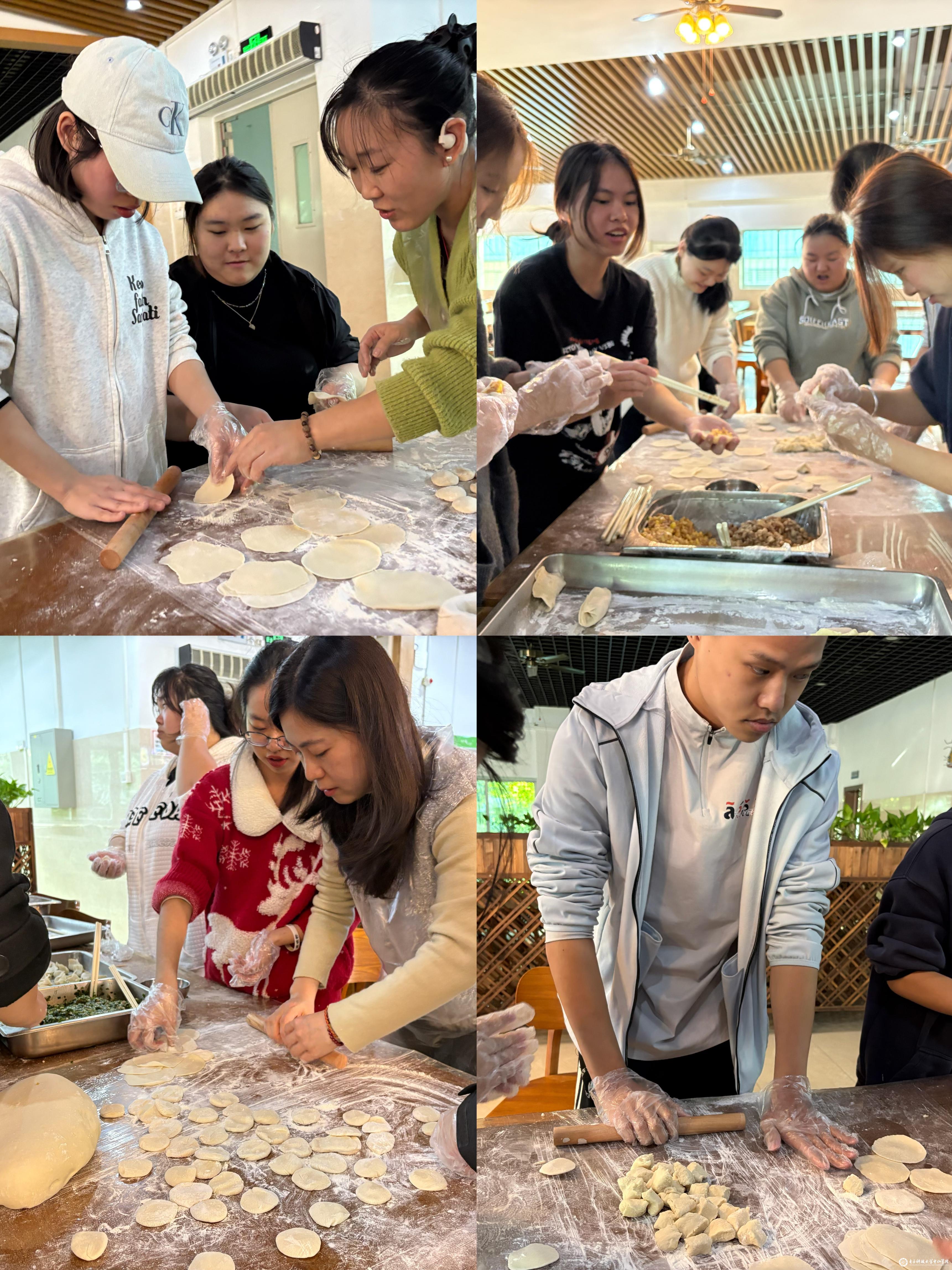 当天下午,在凤翔餐厅三楼,笑声连连,节日的喜悦洋溢在每个同学的脸上。老师与同学们分工协作,揉面、擀皮、调馅、包饺子,每一个步骤都认真对待,每一个细节都倾注了满满的心意。活动期间,老师们不仅传授了包饺子的技巧,还与学生们亲切交流,询问他们的学习与生活情况,同学们也积极参与其中,他们相互学习、相互帮助,共同完成了一个个形态各异的饺子。有的饺子小巧精致,宛如艺术品;有的饺子则略显“豪放”,但那份纯真与热情却让人倍感亲切。在欢声笑语中,师生欢聚一堂,共同体验传统民俗的魅力,感受家的温暖与团圆的美好。